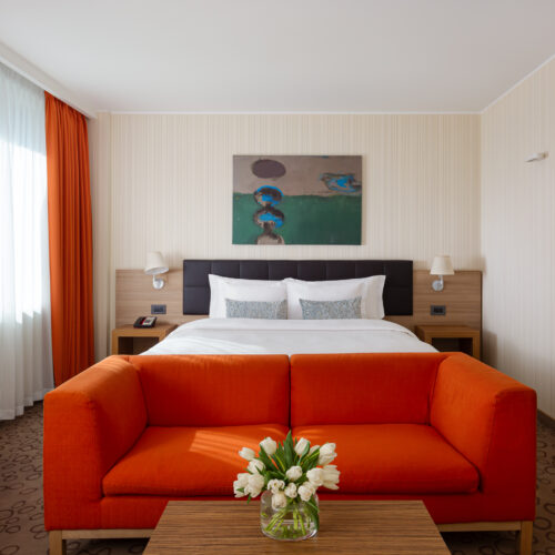 Spacious rooms category “Business” an area of 38 m2 with one double bed 2*2 m. the rooms overlook the panorama of the theatre square.