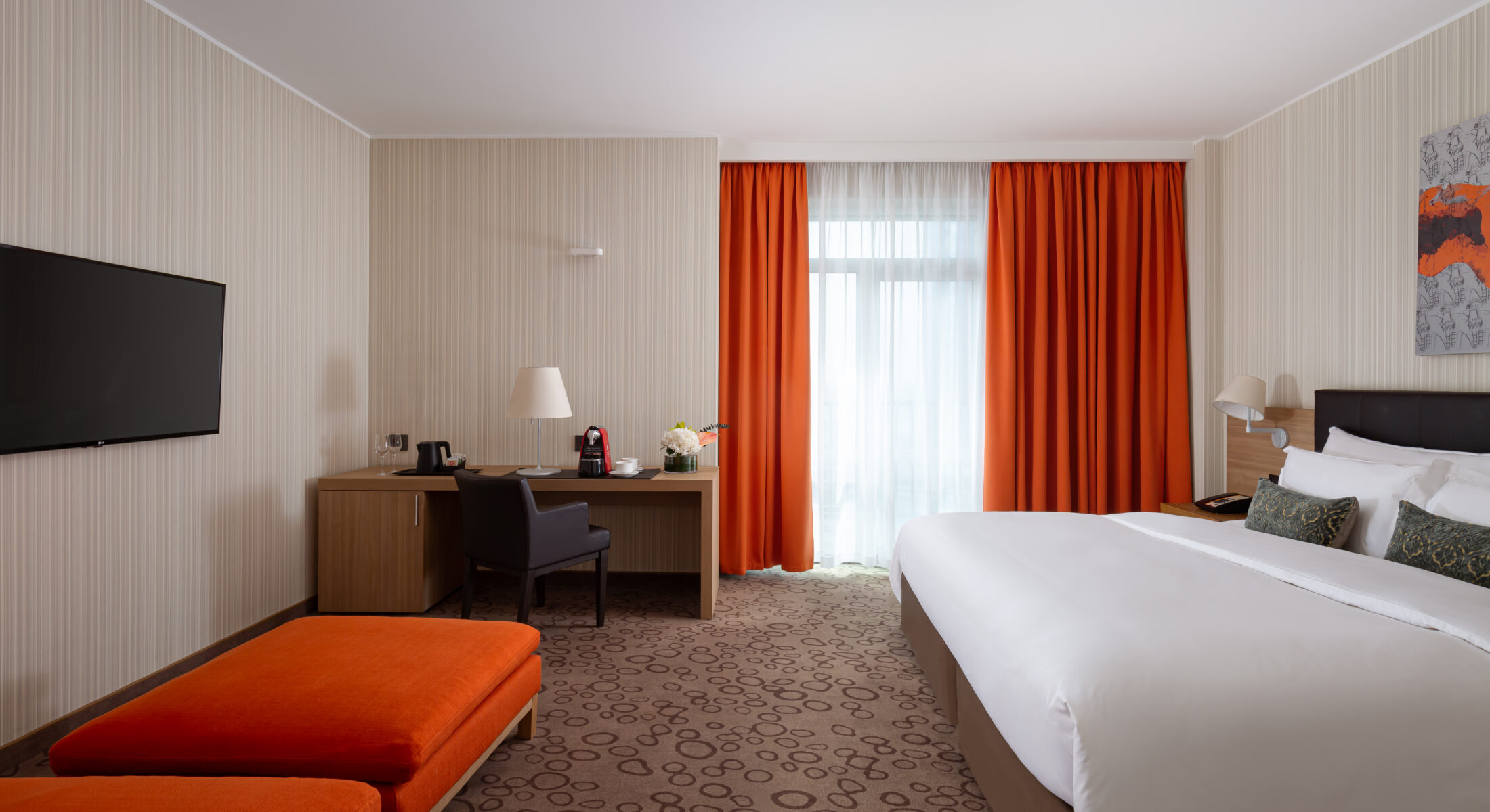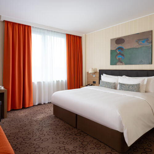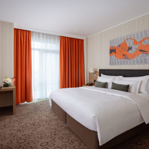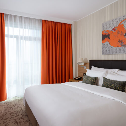 Guests enjoy bright, comfortable lodging adorned with Italian furniture and “The Seasons” décor, accentuating warm tones and colour accents. From the large windows extending from the floor an impressive view of the city center is to be seen.