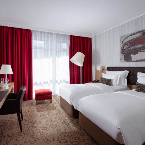 Просторные номера категории «Классик» площадью 26 м2 с одной двуспальной кроватью 2*2 м или двумя односпальными кроватями 1*2м.