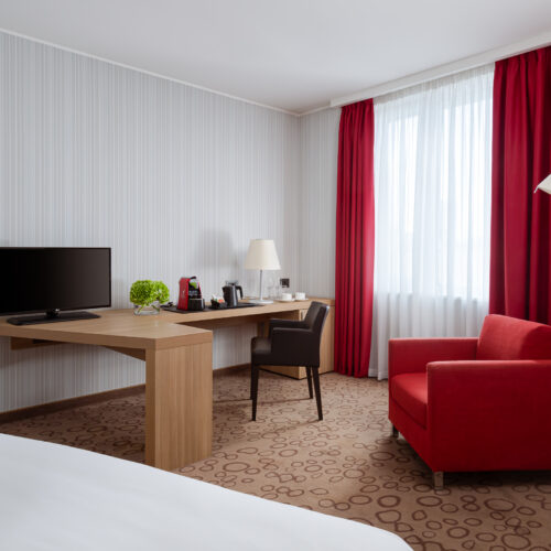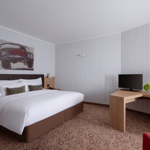 Позволяющие не только полноценно отдыхать, но и комфортно работать номера категории «Супериор» площадью 32 кв.м с одной двуспальной кроватью 2*2 м и расширенной рабочей зоной.